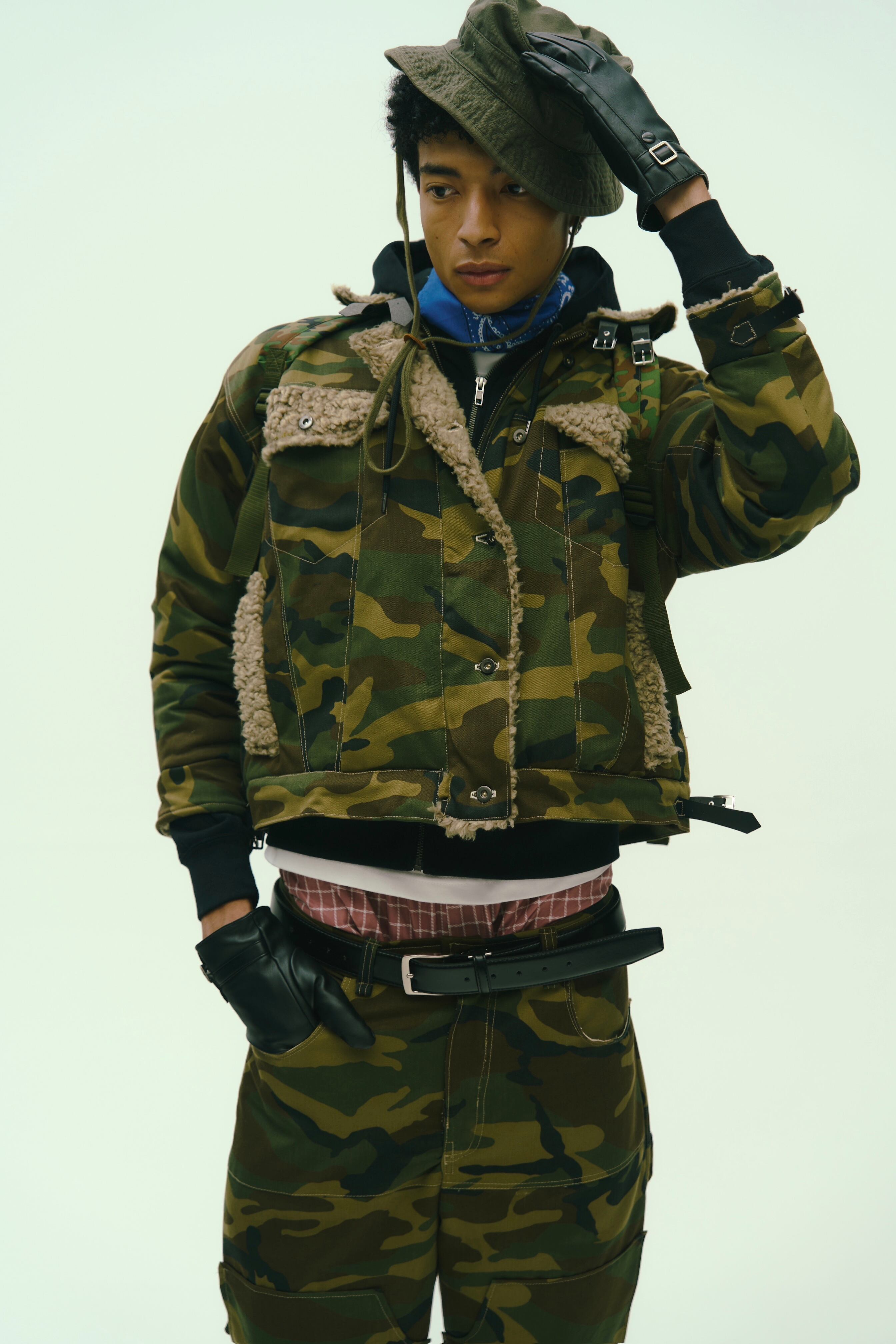 These denim-style pants are designed as a set with the CAMOUFLAGE JACKET.They feature a double-knee construction for added durability, and the back outer pockets are accented with contrasting boa fabric.