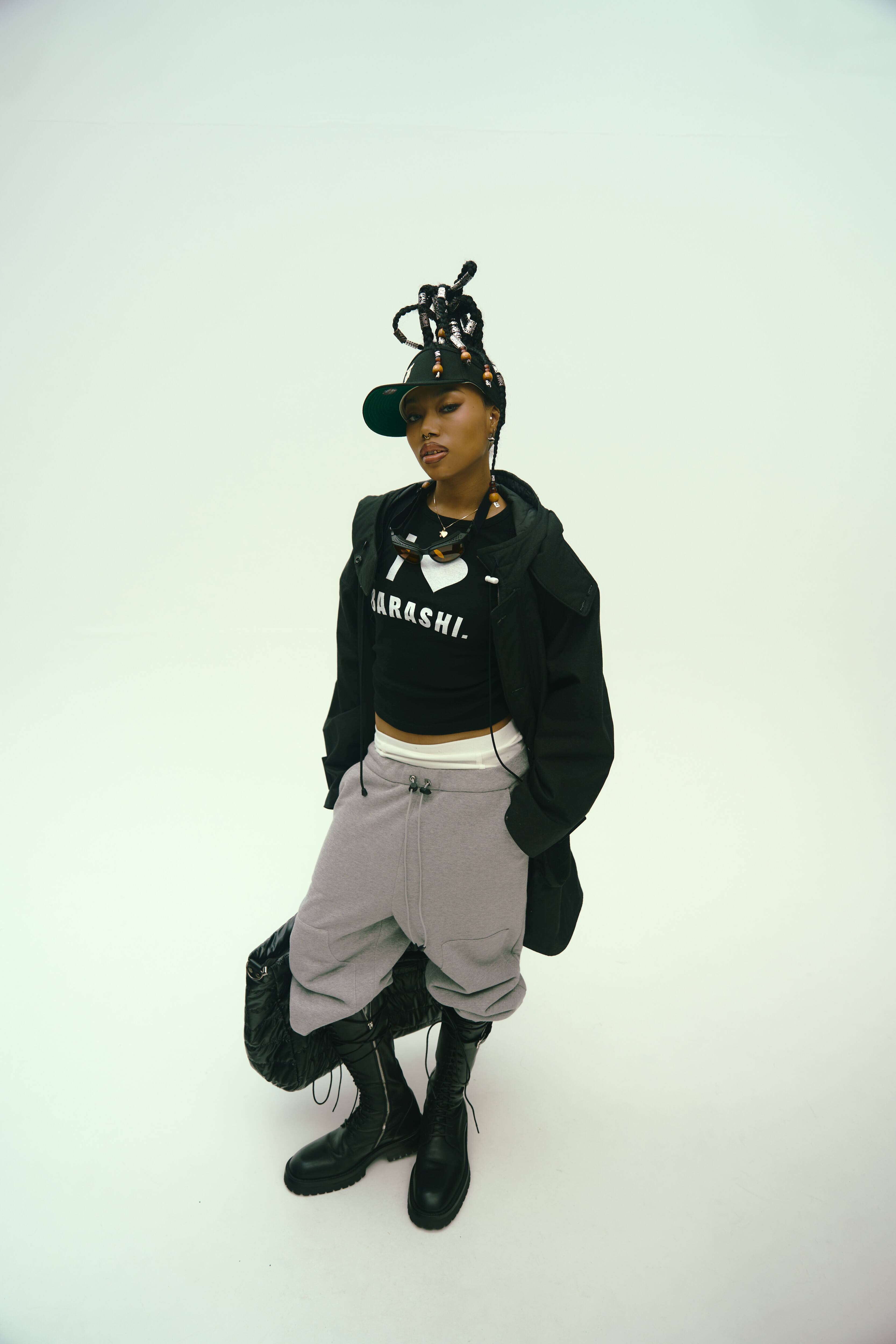 程よいラメ糸が織り込まれた、中肉のダブルニーのスウェットパンツである。シルエットは程よく太く、裾で溜まるパンツとなっている。