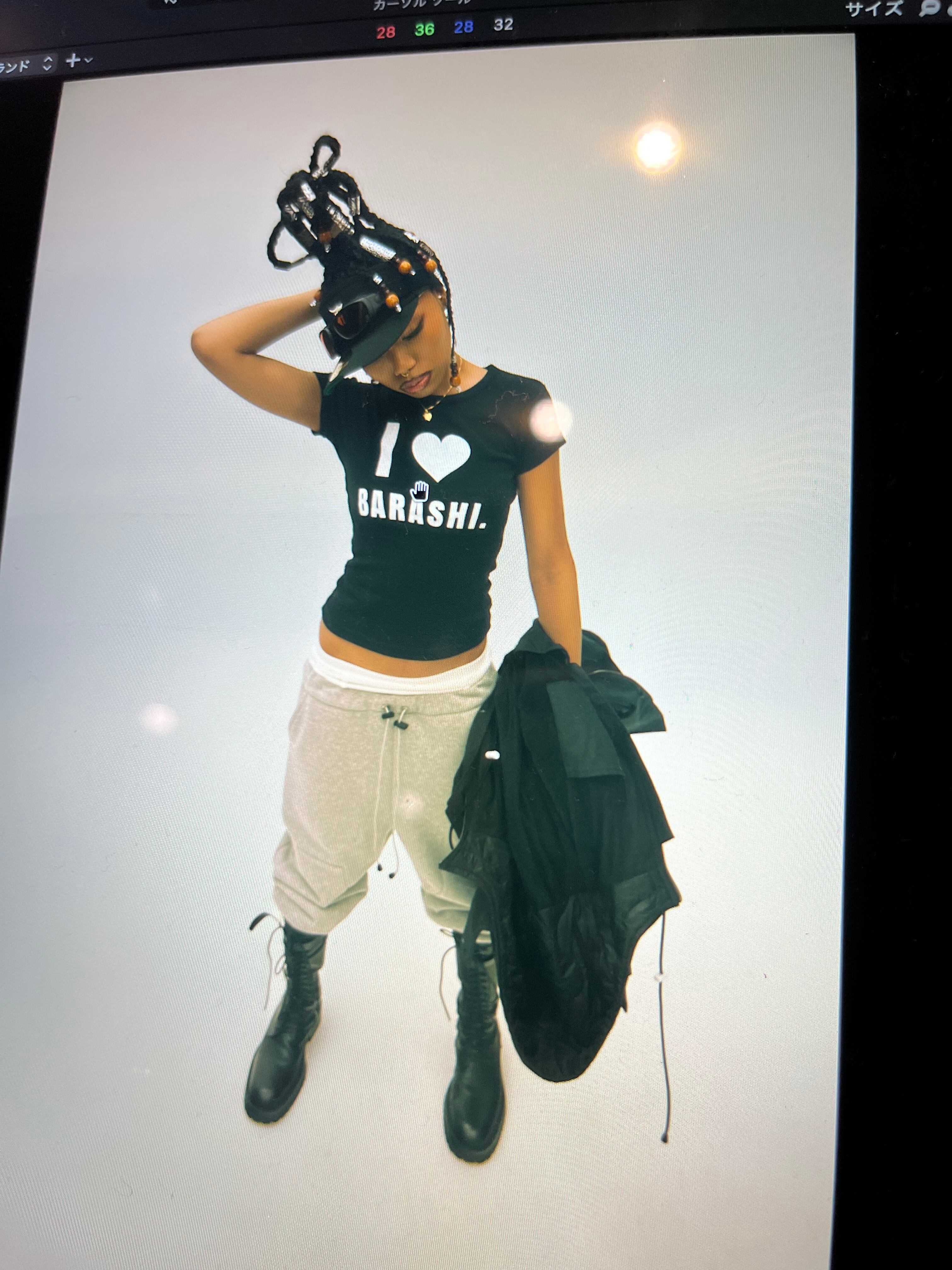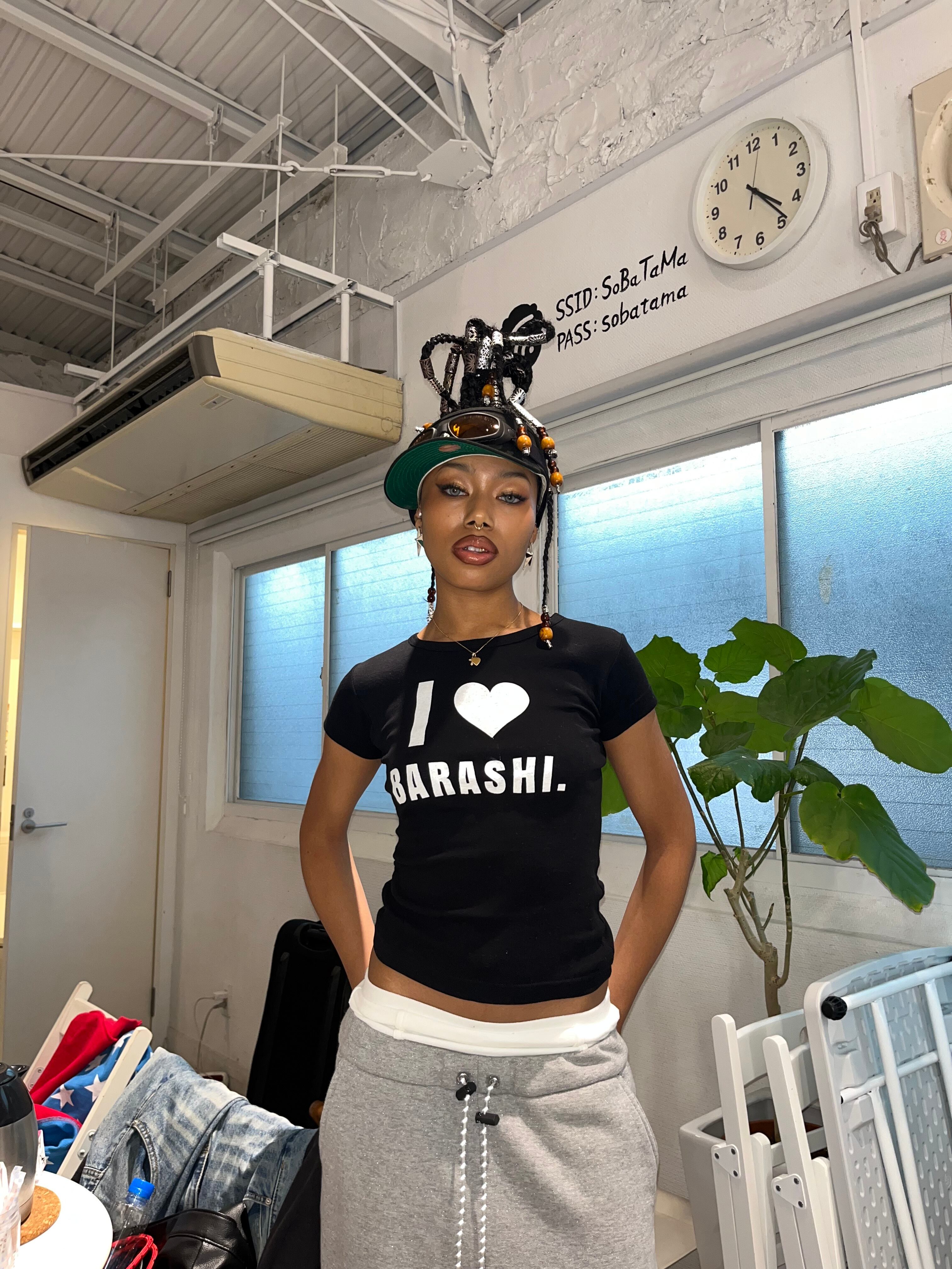 タイトなTシャツに、シルクスクリーンでI♡ BARASHIとプリントされたアイテムである。